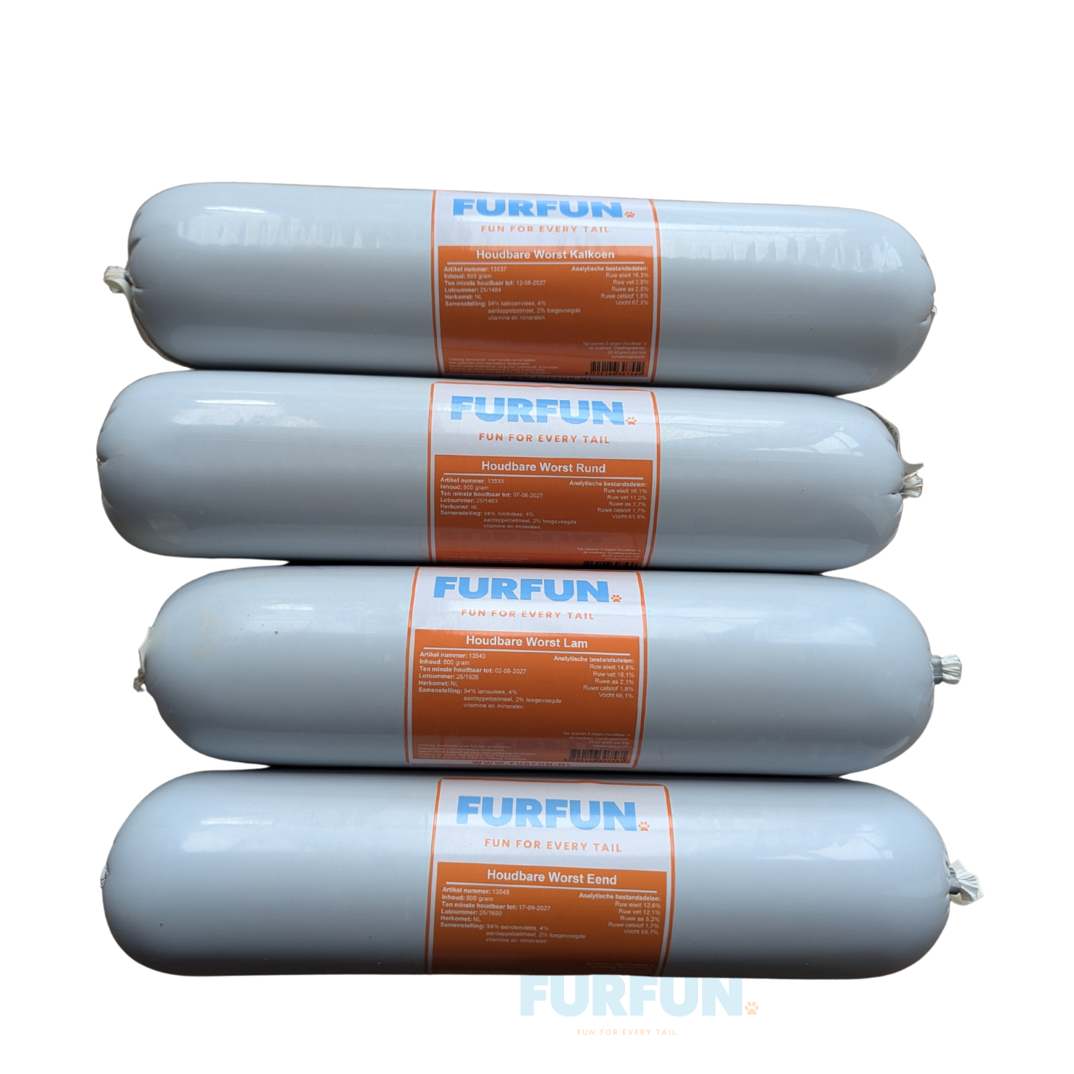 Verwöhnen Sie Ihren Hund mit FurFun Langzeitwurst. Diese gedämpfte, schmackhafte Leckerei ist in sechs köstlichen Sorten erhältlich: Rind, Lamm, Pute, Ente, Pferd und Fischmix. Ideal als Alleinfutter, als schmackhaftes Topping für Trockenfutter oder als Belohnung beim Training. Dank des hohen Fleischanteils erhält Ihr Hund eine nahrhafte und natürliche Proteinquelle, die ihm Energie, Muskelaufbau und ein gesundes Fell schenkt.