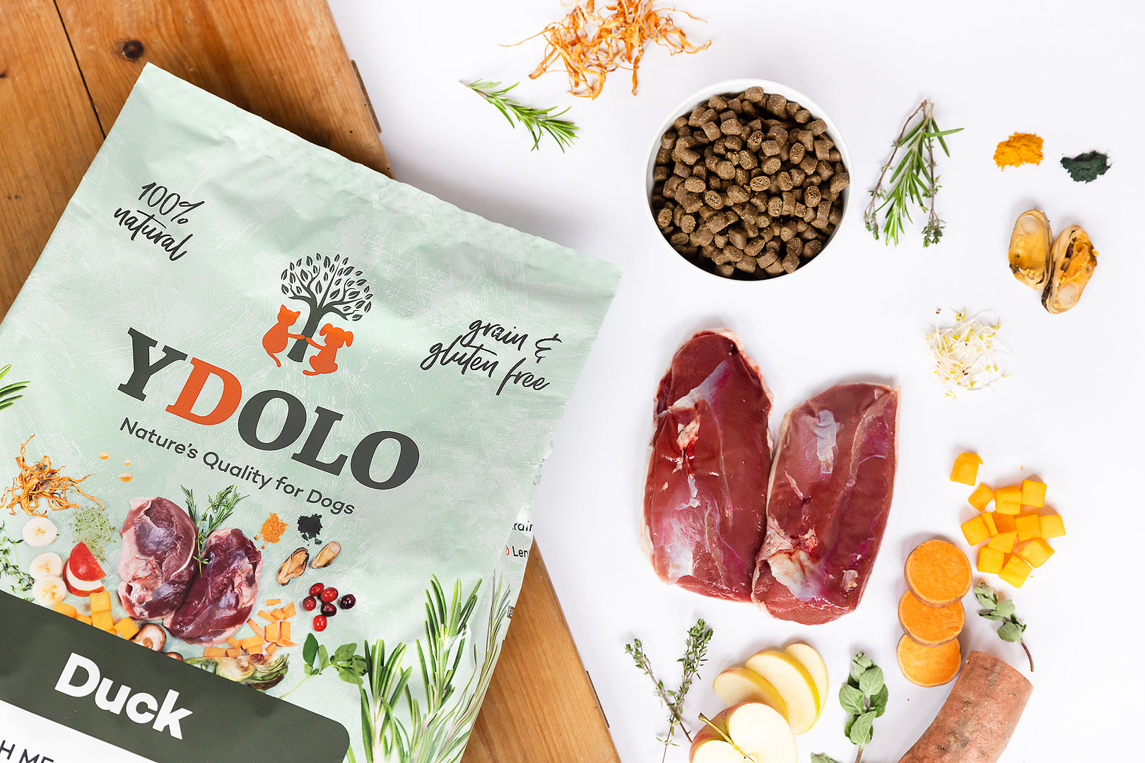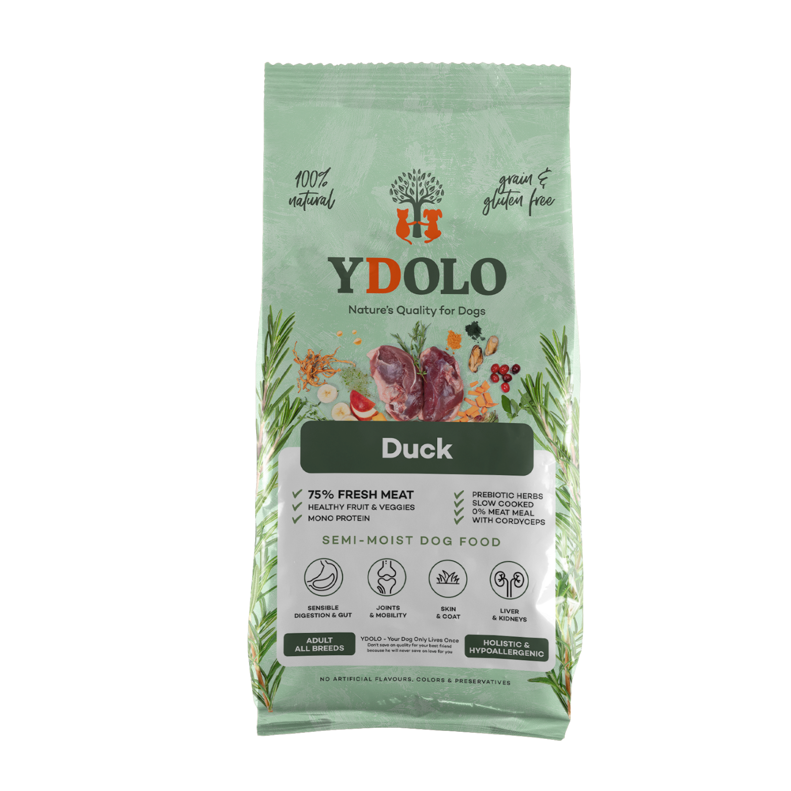 YDOLO Duck wurde speziell für erwachsene Hunde entwickelt, die nicht nur leckeres Futter wünschen, sondern auch von zusätzlicher Unterstützung für Gelenke, Verdauung und Immunsystem profitieren. Dieses weiche, halbfeuchte Trockenfutter ist reich an frischer Ente und voller natürlicher Superfoods – perfekt für Hunde mit empfindlichem Magen oder Allergien.