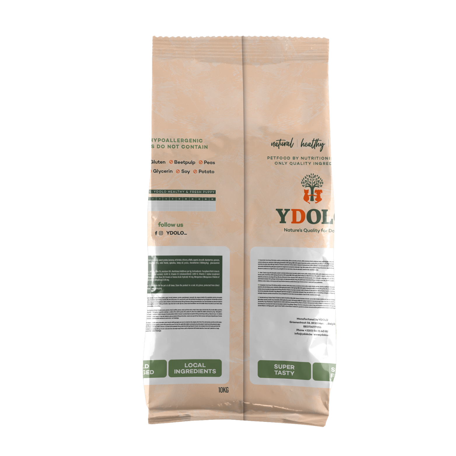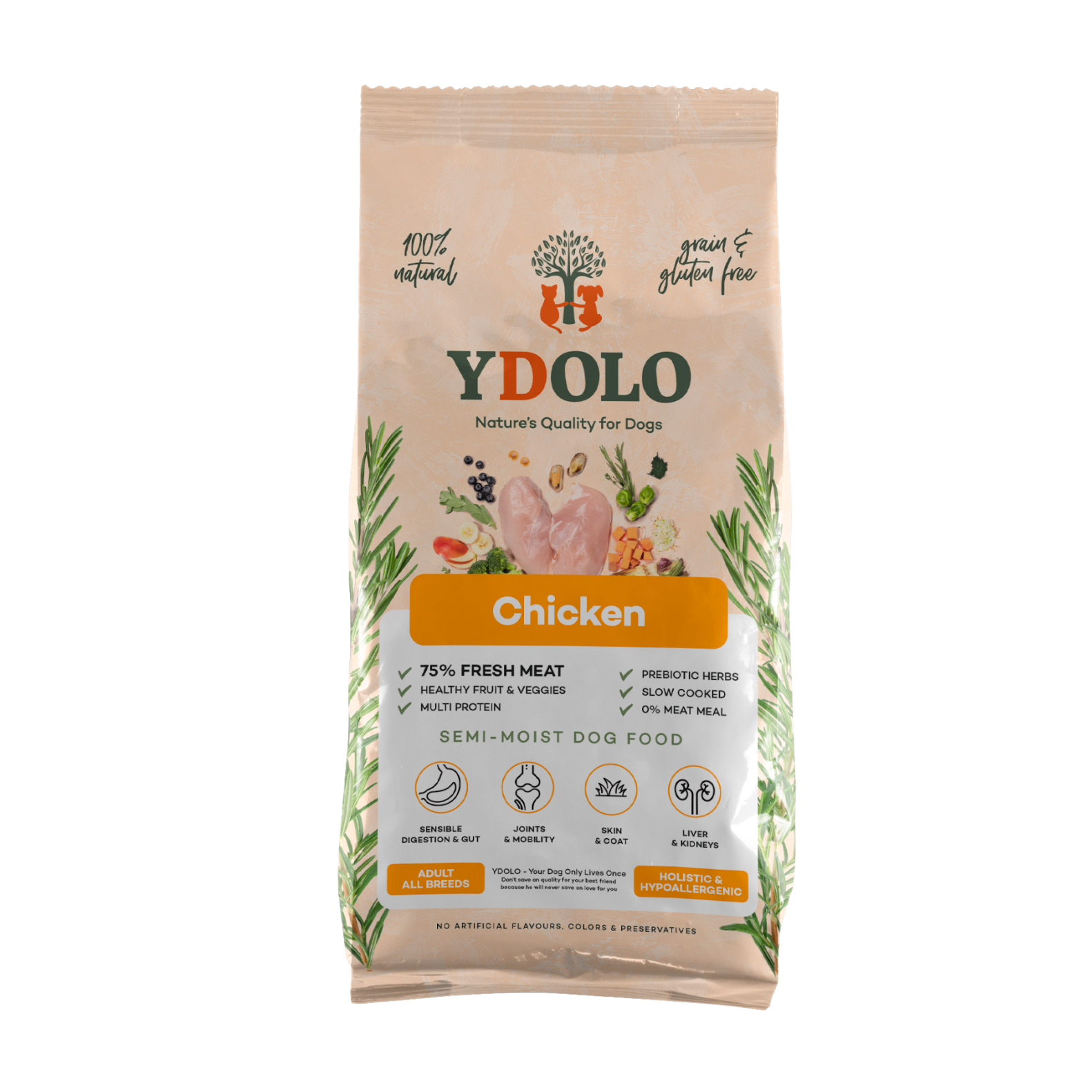 YDOLO Chicken is een luxueuze, halfvochtige hondenbrok op basis van 75% vers vlees en wilde vis, samengesteld voor honden met gevoelige darmen, huidproblemen of gewrichtsproblemen. Bereid met liefde, gestoomd op lage temperatuur en boordevol natuurlijke ingrediënten – voor een gelukkige, vitale hond die elke brok met smaak opeet.